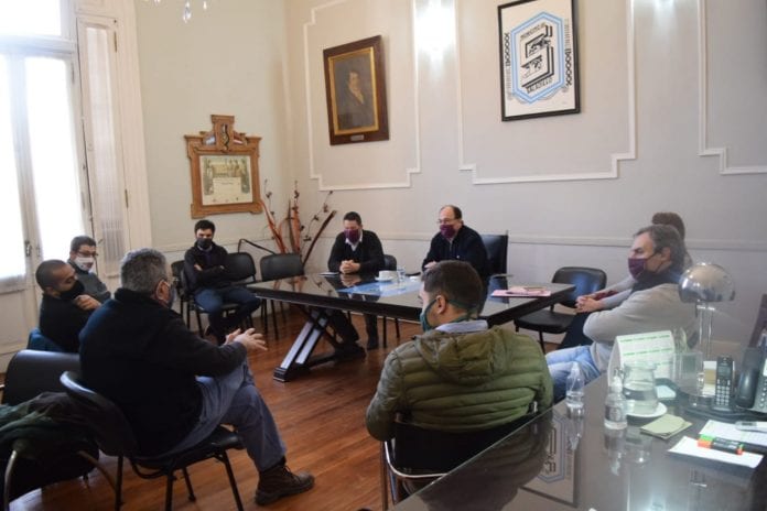 El Intendente José Luis Salomón junto al Secretario de Desarrollo Local Vladimir Wuiovich y al Subsecretario Tomás Chaime, renovaron el convenio con la cooperativa molinera SICSA, representada por autoridades de la cooperativa, Daniel Juan, Aldo Oran y Hernán Ricci, para la utilización del predio donde va a construirse la playa de estacionamiento para camiones.