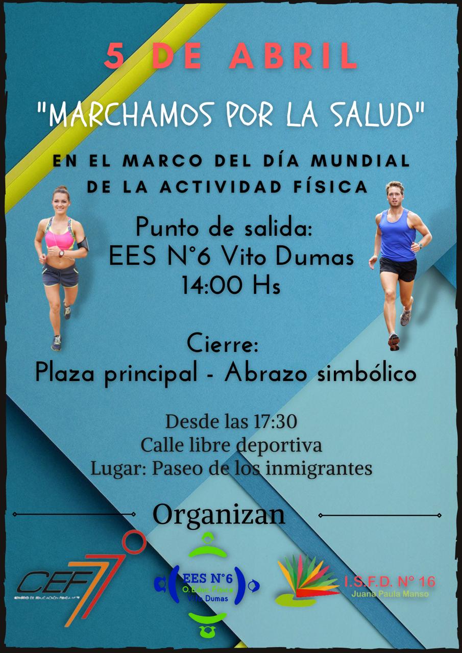En el marco del día mundial de la actividad física instituciones de nuestras ciudad organizan para el día 5 de abril una caminata la cual tendrá inicio a las 14:00 desde la escuela EES Nº 6 Vito Dumas hasta llegar a la plaza principal donde se realizara un abrazo simbólico.-