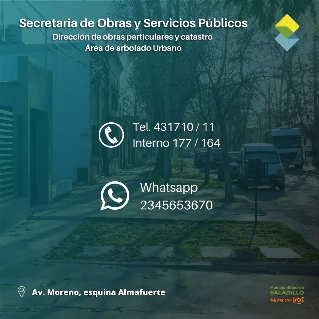Ante cualquier consulta y/o asesoramiento, estamos a su disposición todos los días en Av. Moreno esquina Almafuerte en la Dirección de Arbolado Urbano y la Dirección de Catastro y Obras Particulares de 7:30 a 13:30.