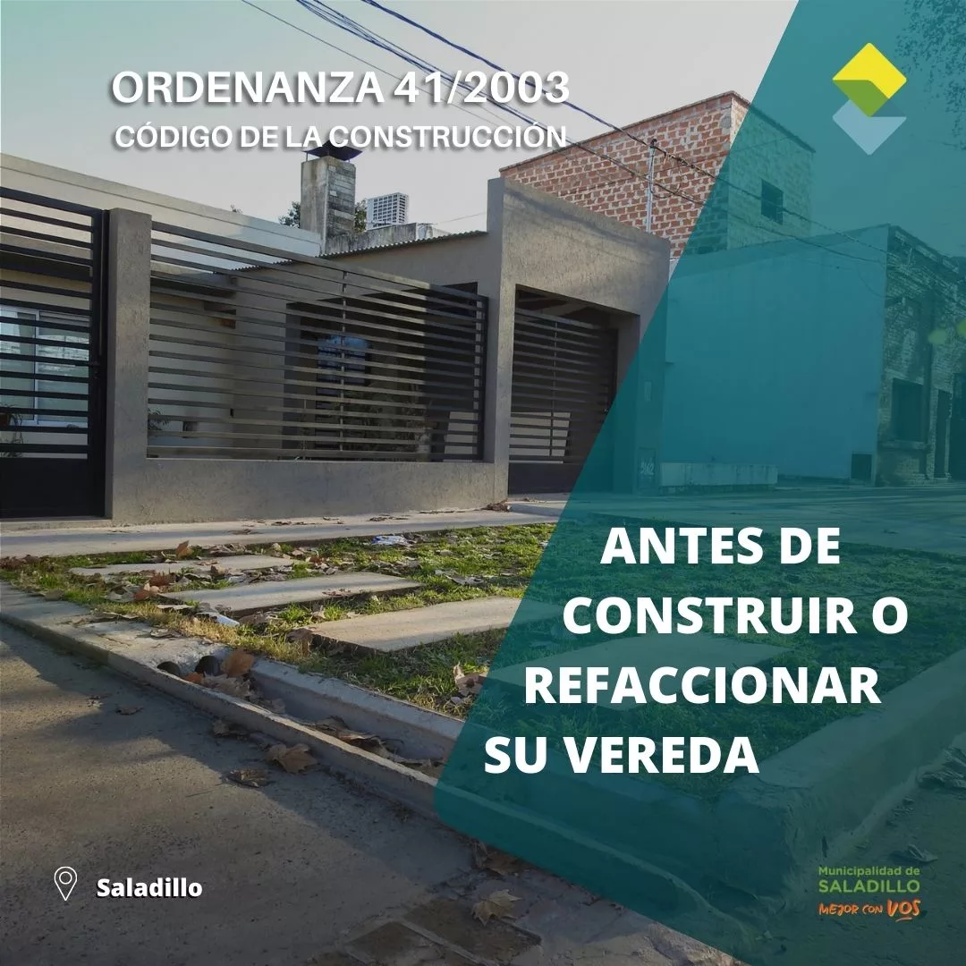 Si Usted tiene que hacer su vereda nueva, o refaccionar la existente, tenga en cuenta que hay Ordenanzas que cumplir: materiales, pendientes mínimas, cazuelas para arbolado público, accesibilidad en esquinas, pasos mínimos, sectores verdes, entre otras cosas.