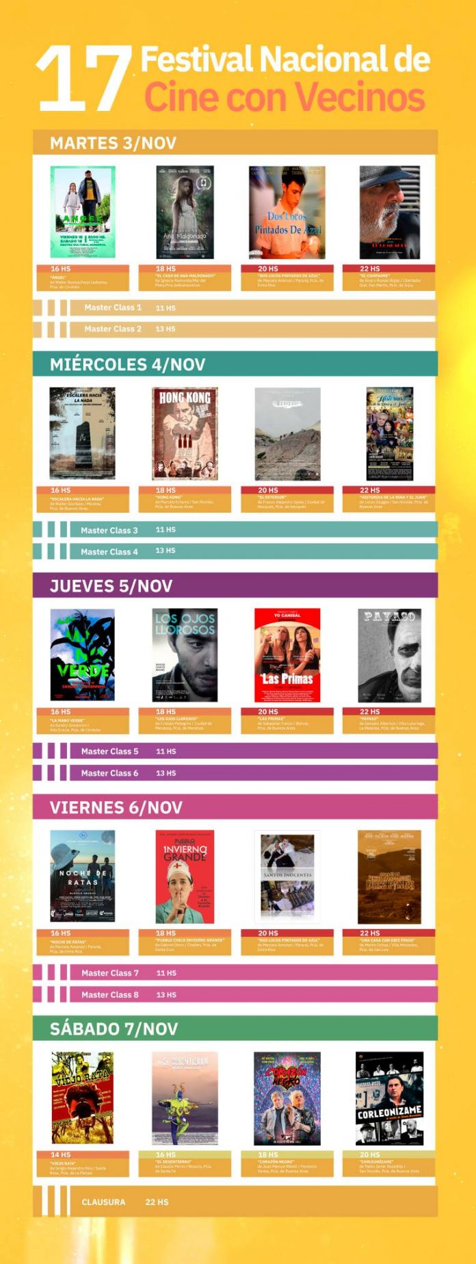 Un reconocido Jurado evaluó los largometrajes de la Sección Competencia, que se podrán visionar gratis desde este martes 03 de noviembre. Las películas se irán estrenando cada día, en diferentes horarios, y permanecerán on-line disponibles hasta el sábado 07 de noviembre cuando por la noche se anuncien los ganadores en los rubros Mejor Guión, Mejor Producción y Mejor Película. Este año, el Jurado está integrado por Carmen Guarini (Reconocida cineasta, antropóloga y docente / Integrante de la Comisión de Género de la DAC), Osvaldo Santoro (Reconocido actor y escritor / Secretario General en SAGAI), Norma Argentina (Actriz puntana de mayor renombre a nivel nacional e internacional), Asunción Rodríguez (Responsable del Cine Móvil Jujuy,), Cecilia Fiel (Cineasta, guionista, docente y productora), Andrea Álvarez (Distribuidora, Socia Gerente en Batata Films), Hernán Gaffet (Cineasta y guionista), Fernando Salem (Cineasta, guionista y productor) y Mauricio Minotti (Cineasta, guionista y productor / Integrante del Consejo de Administración de la Fundación Cine con Vecinos). Además, cada día, se programan CONVERSATORIOS con reconocidas figuras de la industria cinematográfica.