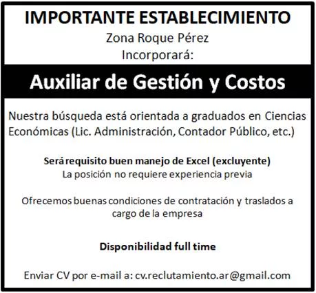 Zona Roque Pérez Incorporará: Auxiliar de Gestión y Costos