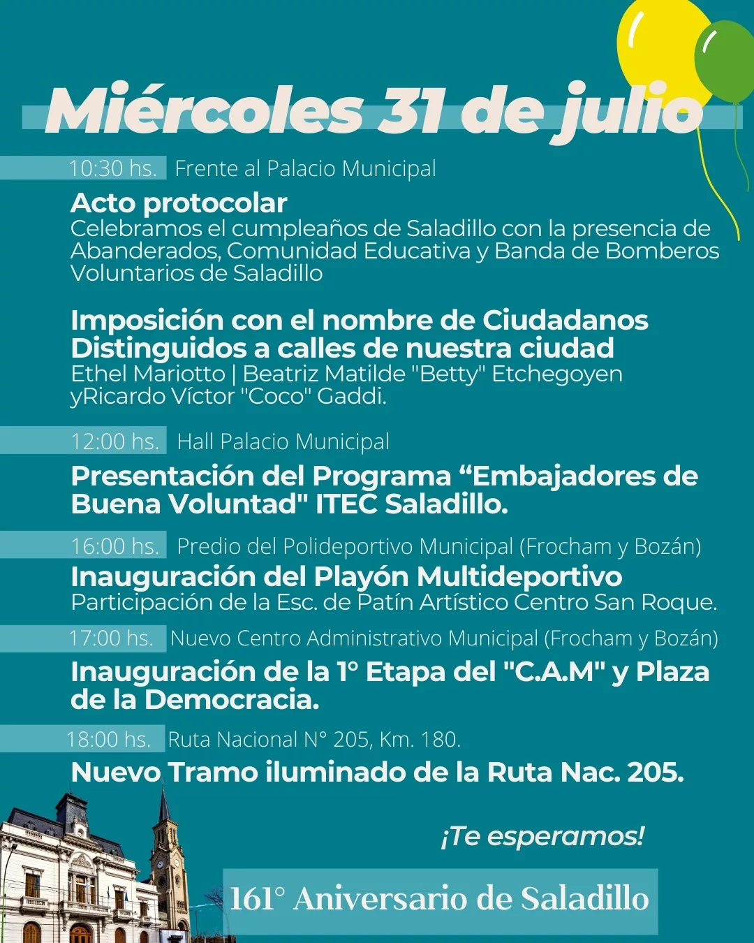 SaladilloInformación General Cronograma || Actividades que se realizarán el 31/07 por el «161° Aniversario de Saladillo» julio 30, 2024 - Publicidad -