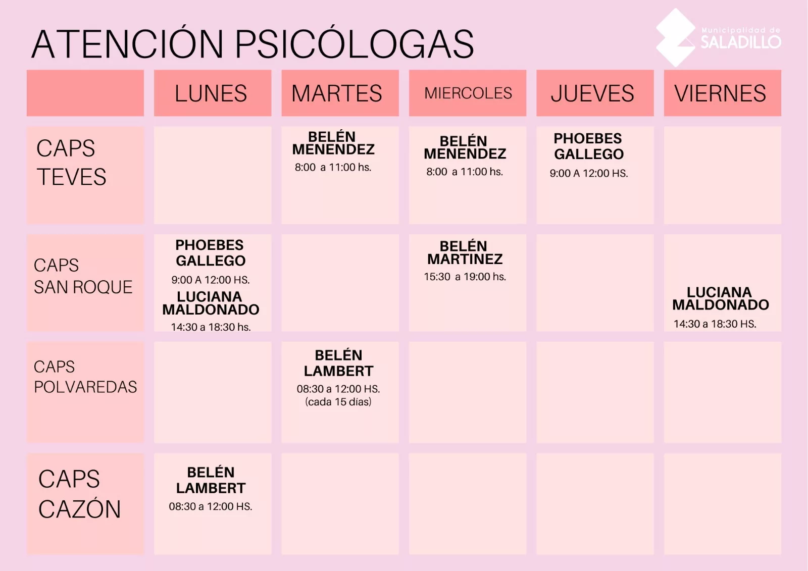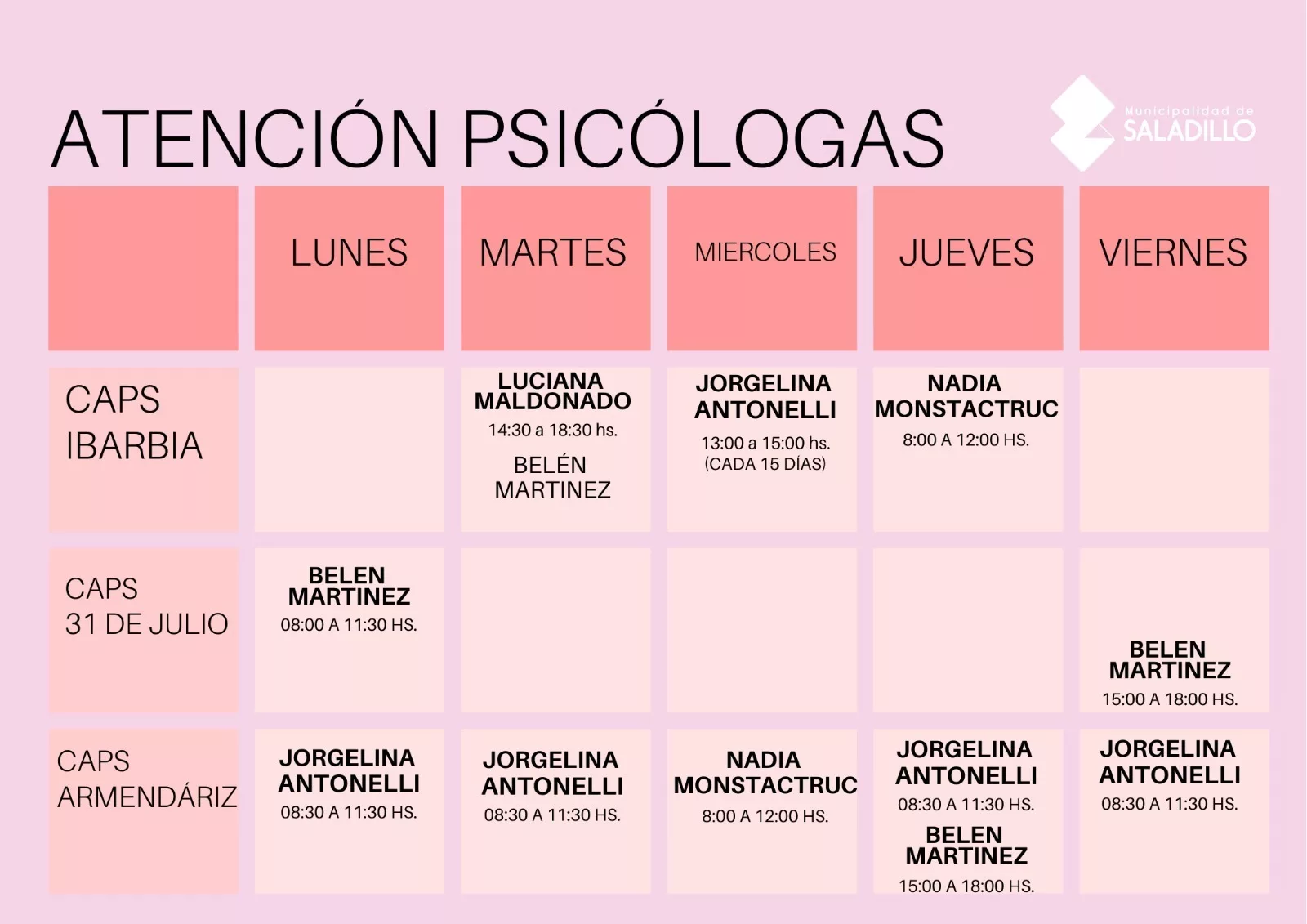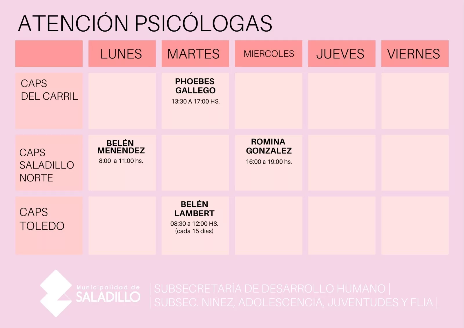 La Subsecretaría de Desarrollo Humano y la Subsecretaria de Niñez, Infancia, Adolescencia y Juventudes, dependientes de la Secretaría de Gobierno, informan a la comunidad los días y horarios de atención del equipo de Psicólogas que brindan servicios en los distintos CAPS, tanto de la Planta Urbana como de las Localidades del Interior.