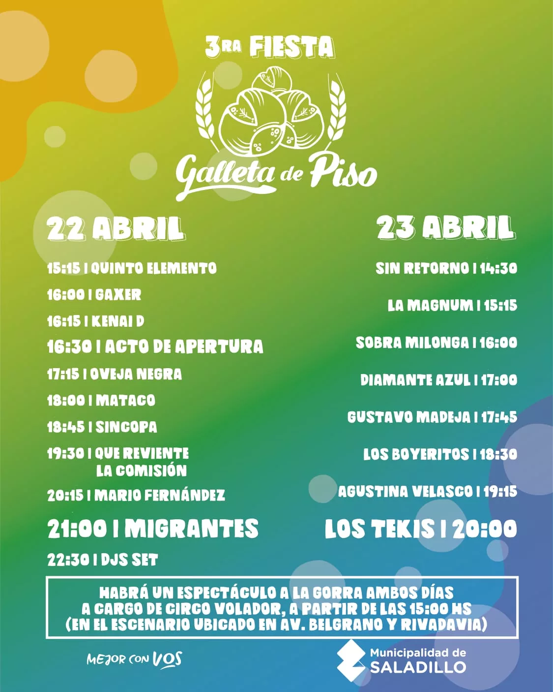 SaladilloInformación General Fiesta de la galleta |Todo listo para el primer día, cronograma de horarios de los espectáculos abril 21, 2023 - Publicidad - FIESTA DE LA GALLETA DE PISO 2023 Compartimos el cronograma artístico de la tercera edición de la Fiesta de la Galleta de Piso que se realizará el 22 y 23 de abril. ¡Los esperamos! #FiestaDeLaGalletaDePiso - Publicidad - #GalletaDePiso #Cultura #CEDHSaladillo #MunicipalidadDeSaladillo #MejorConVos #Saladillo