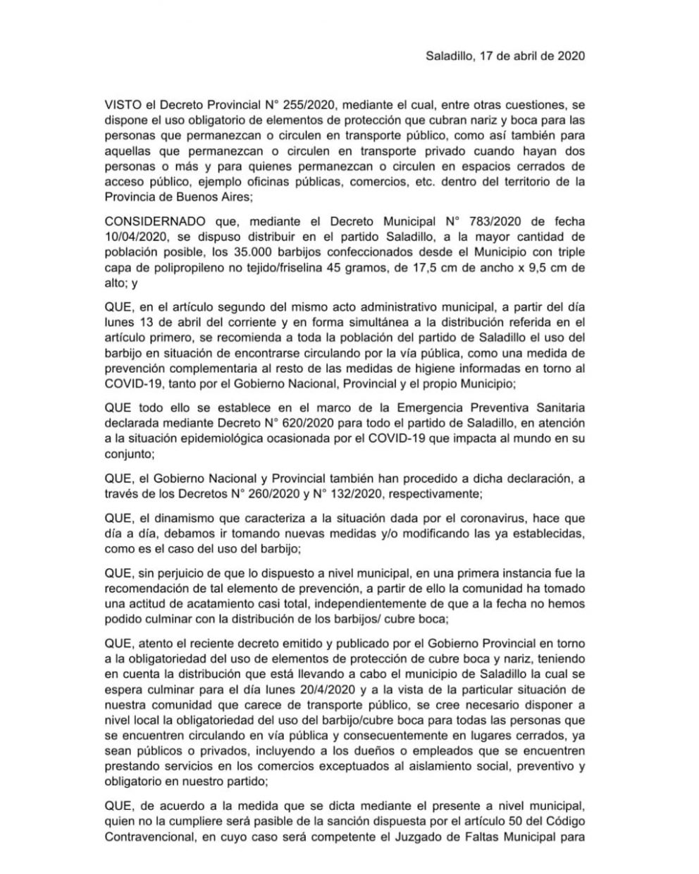 QUE, en el artículo segundo del mismo acto administrativo municipal, a partir del día lunes 13 de abril del corriente y en forma simultánea a la distribución referida en el artículo primero, se recomienda a toda la población del partido de Saladillo el uso del barbijo en situación de encontrarse circulando por la vía pública, como una medida de prevención complementaria al resto de las medidas de higiene informadas en torno al COVID-19, tanto por el Gobierno Nacional, Provincial y el propio Municipio;