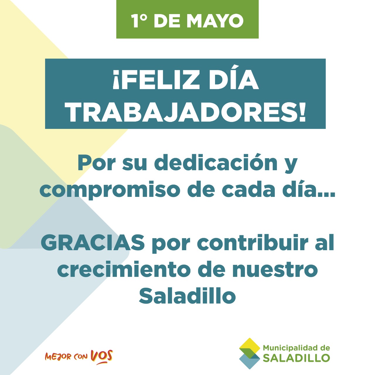 Desde la Municipalidad de Saladillo, deseamos que hoy sea un día de descanso para todos los trabajadores, que contribuyen con su acción cotidiana al crecimiento de nuestra ciudad.