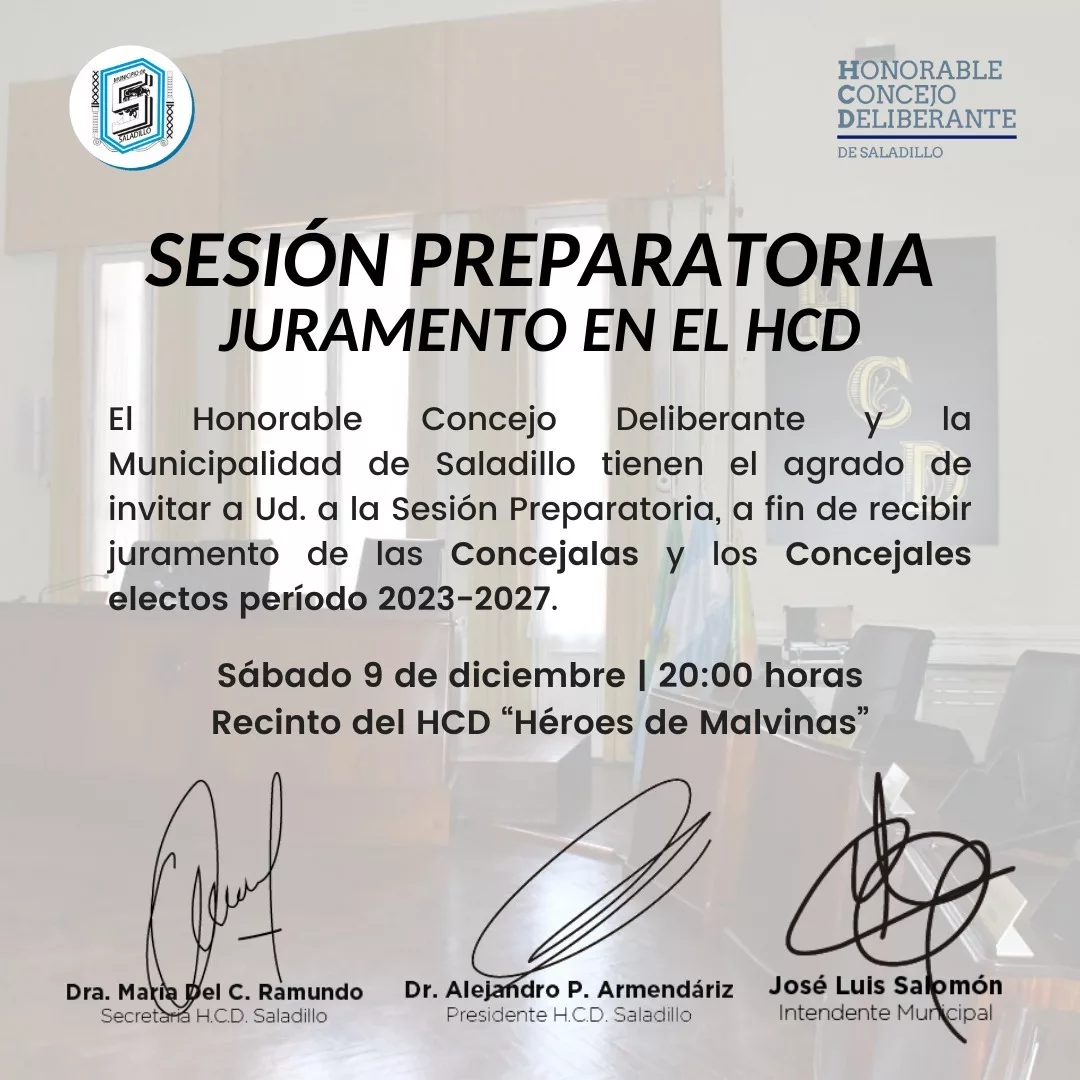 Desde el Honorable Concejo Deliberante y la Municipalidad de Saladillo se invita a participar del juramento de los nuevos concejales el próximo Sábado 9 de Diciembre a las 20 horas en el Recinto Héroes de Malvinas