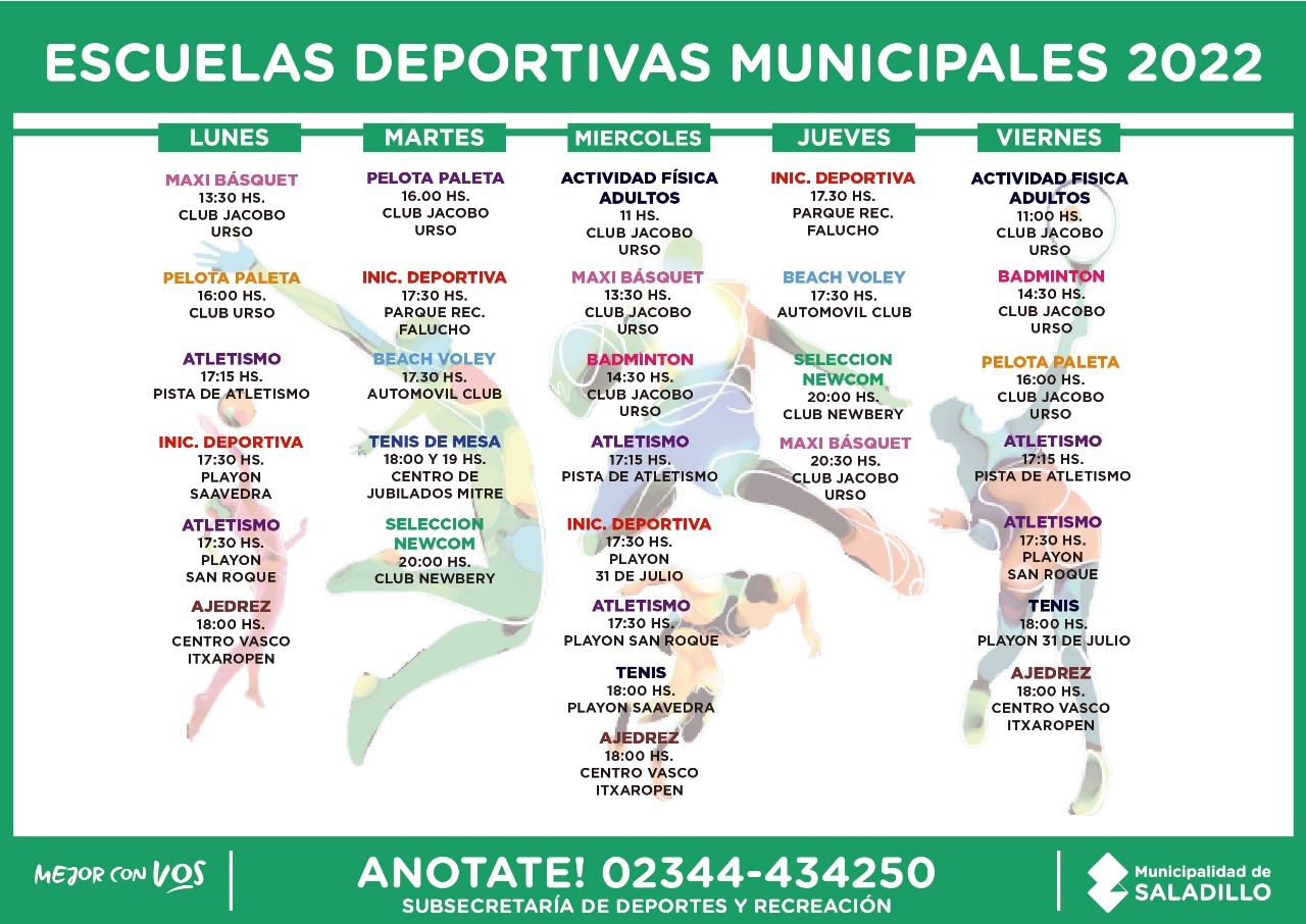 Te dejamos el cronograma para cada deporte. En caso de consultas podes comunicarte con la subsecretaria de Deportes y Recreación llamando 02344 434250.