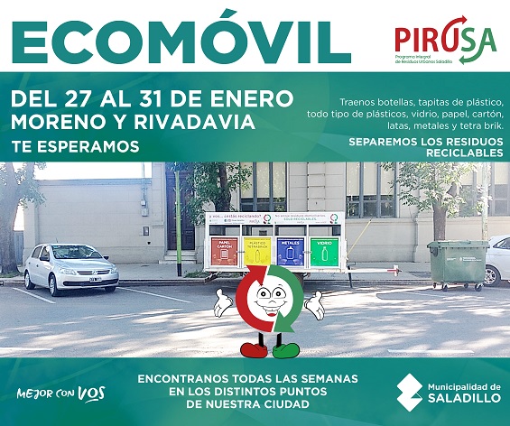 SaladilloInformación General ECOMOVIL en Moreno y Rivadavia enero 27, 2020 - Publicidad - En la última semana del mes de enero, el ECOMOVIL se encuentra ubicado en Moreno y Rivadavia de Saladillo.