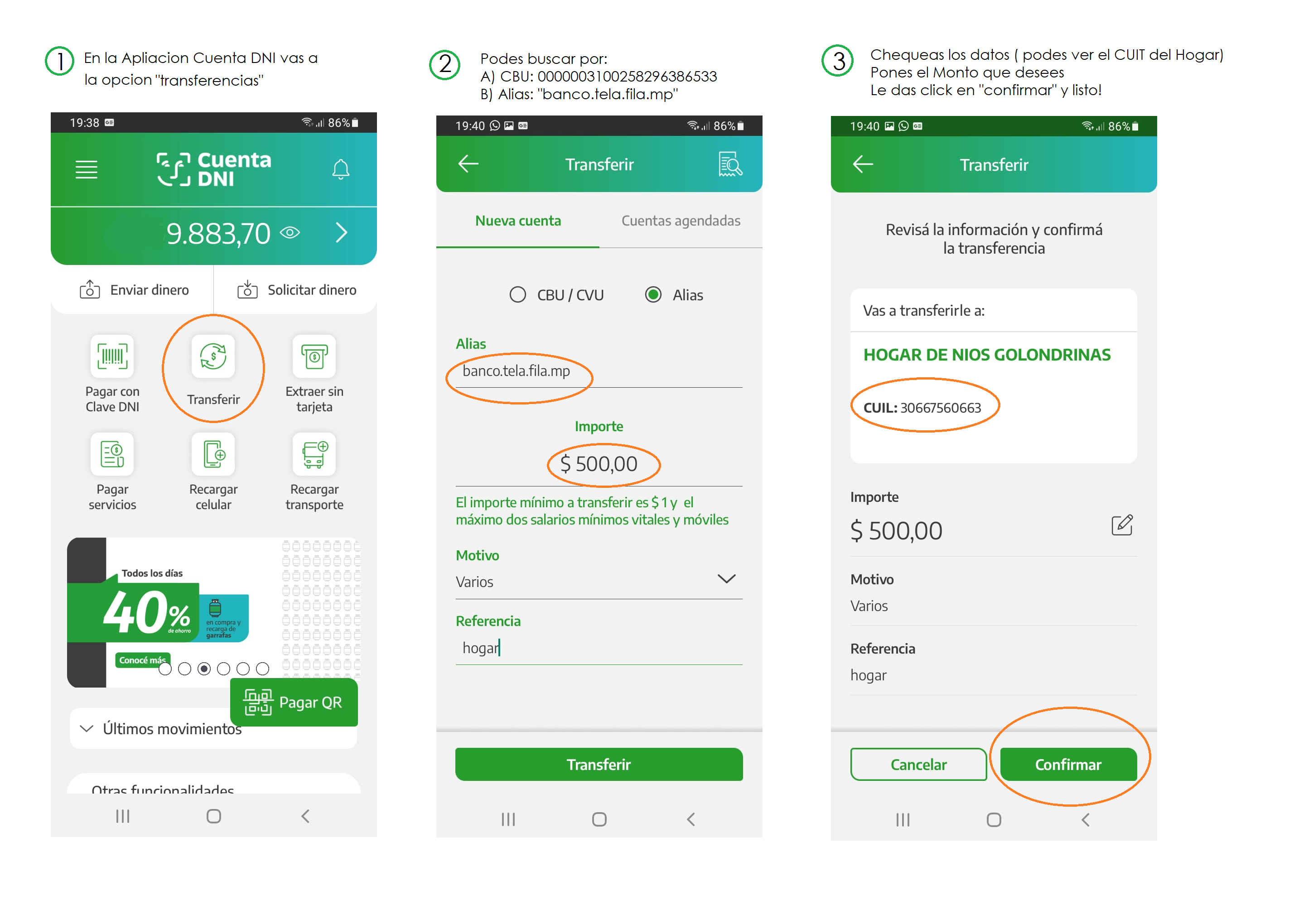 2) Desde la Aplicación «Cuenta DNI», pueden transferir al «CVU» 0000003100258296386533 o al «Alias» banco.tela.fila.mp» ( dejamos un instructivo por las dudas)