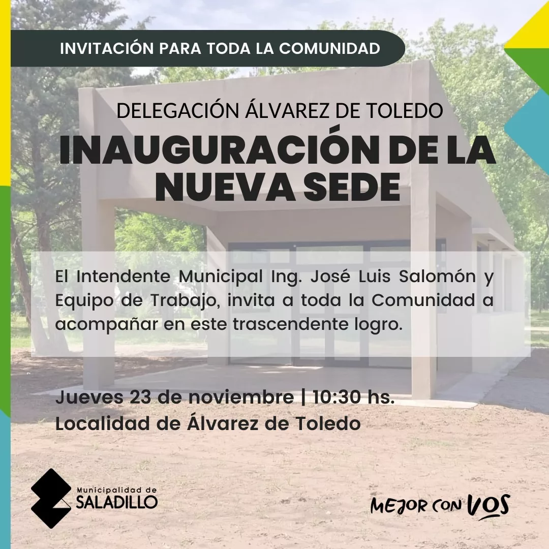 El Intendente José Luis Salomón y Equipo de trabajo, invitan a toda la comunidad a participar del acto de inauguración de la nueva sede de la Delegación de Álvarez de Toledo, obra desarrollada en su totalidad con fondos municipales.
