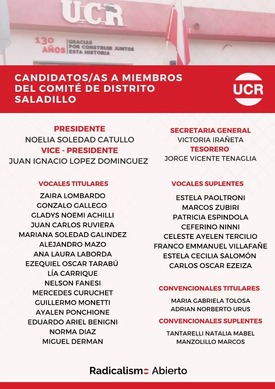 Por su parte, Noelia Catullo llamó a continuar con la idea de Radicalismo Abierto. «Este partido es de todos los que crean en la política como herramienta para transformar la realidad. Todos los que quieran participar siempre van a encontrar las puertas abiertas de este comité y de esta conducción. Necesitamos de todos para poder ampliar la representación y la identificación con los vecinos, tenemos que escuchar más que nunca sus problemas y necesidades, asumiendo que somos un partido de gobierno y que tenemos la responsabilidad de estar cerca de los que más necesitan. El 2023 nos encontrara con el desafío más lindo que puede afrontar un militante político, preparar una campaña y ofrecerle a Saladilo la mejor alternativa para seguir creciendo. ¡Vamos a trabajar con toda la pasión y las ganas!
