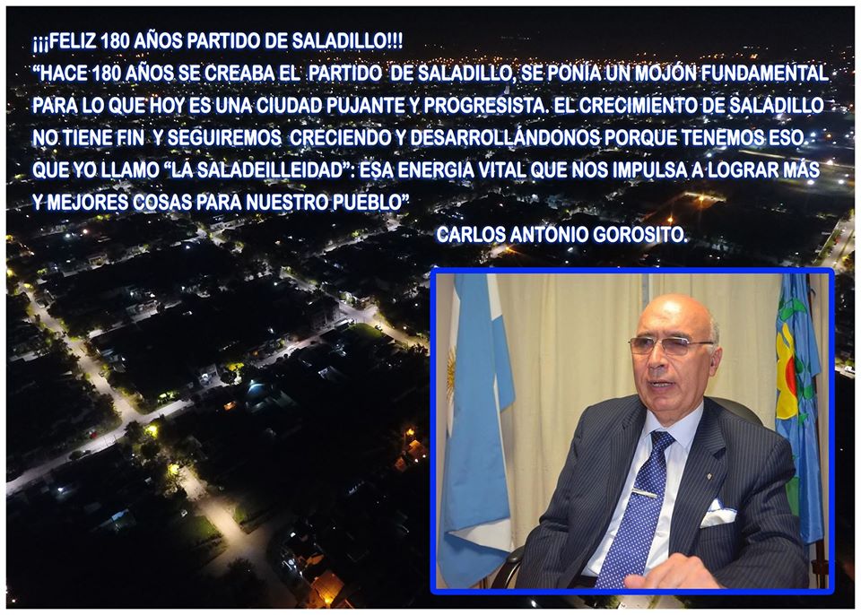 “EL 25 DE DICIEMBRE DE 1839 EL GDOR. JUAN MANUEL DE ROSAS CREABA EL PARTIDO DE SALADILLO. PONÍA UN MOJÓN FUNDAMENTAL PARA LO QUE HOY ES UNA CIUDAD PUJANTE Y PROGRESISTA.HOY DEBEMOS RENOVAR EL COMPROMISO DE SEGUIR TRABAJANDO POR EL CRECIMIENTO Y DESARROLLO DE ESTE PUEBLO DONDE VIVIERON NUESTROS ANTEPASADOS, VIVIMOS NOSOTROS Y VIVIRÁN LAS FUTURAS GENERACIONES” CARLOS ANTONIO GOROSITO.