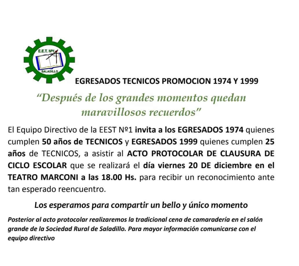 SaladilloInformación General Invitación a egresados de técnicos promoción 1974 Y 1999 diciembre 6, 2024 Escuela Industrial - Publicidad -