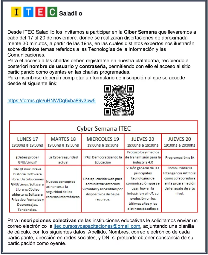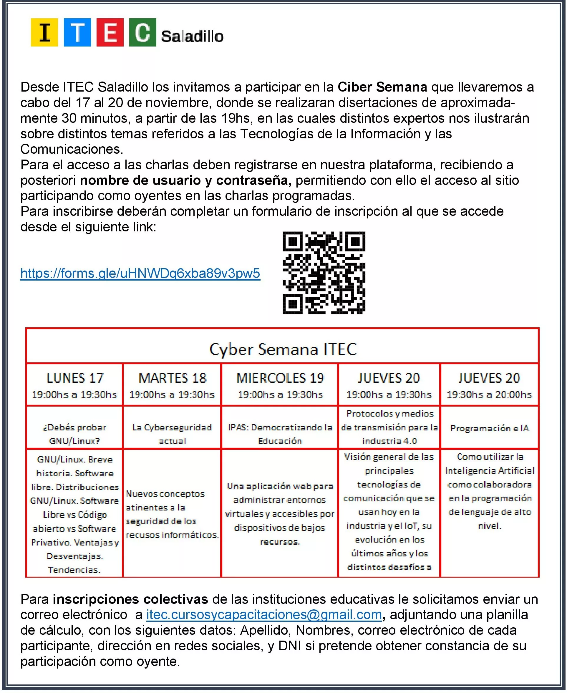 SaladilloInformación General ITEC || Invita a participar de la «Ciber Semana» noviembre 13, 2025 - Publicidad -