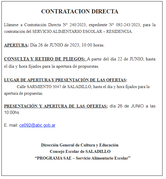 Llámese a Contratación Directa N° 240/2023, expediente N° 092-243/2023, para la contratación del SERVICIO ALIMENTARIO ESCOLAR – RESIDENCIA.