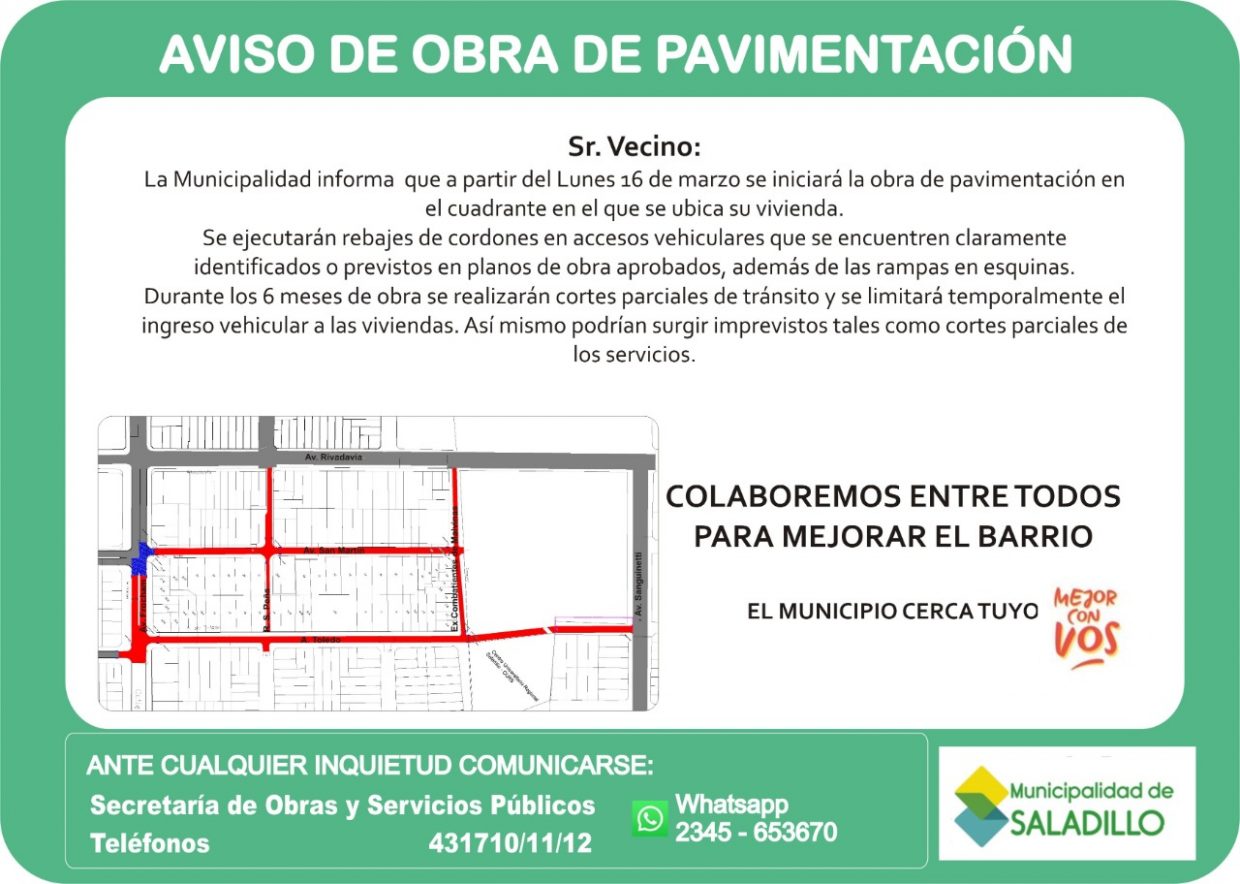 Obras de pavimentación en el casco urbano de Saladillo, las misma comprenderán las calle Toledo desde Av. Frocham hasta Av. Sanguinetti. Av. San Martin desde Frocham a Ex combatiente de Malvinas . Calle Peña desde Toledo a Av. Rivadavia y Ex combatiente de Malvinas desde Toledo a Rivadavia