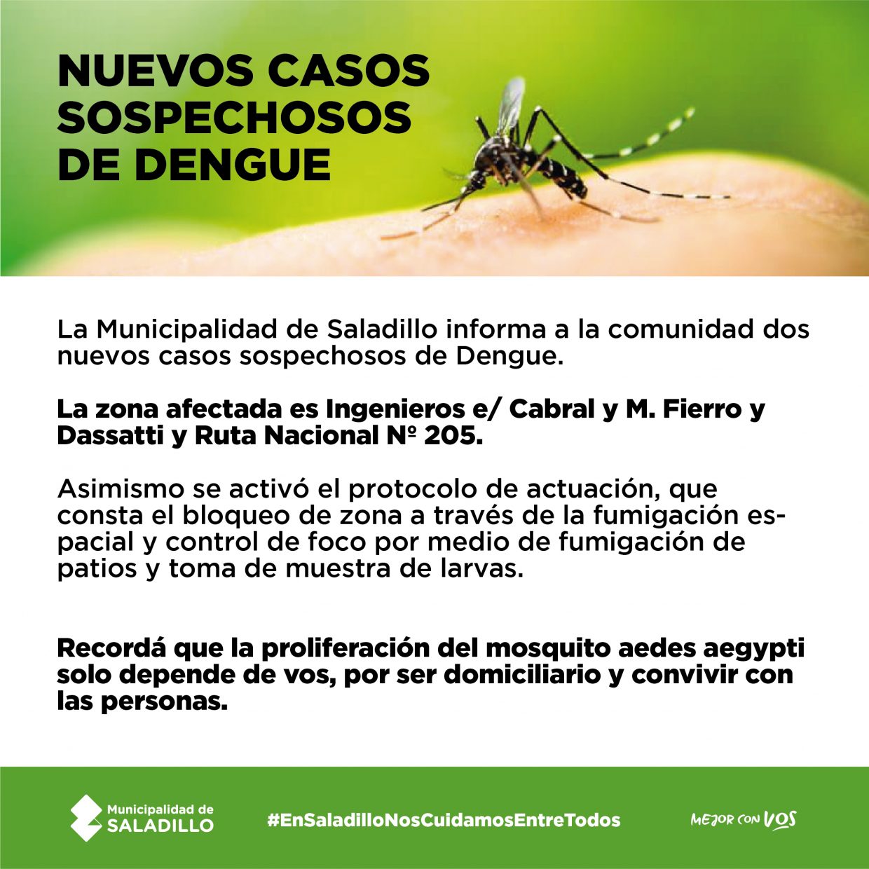 La Municipalidad de Saladillo informa a la comunidad dos nuevos casos sospechosos de Dengue.