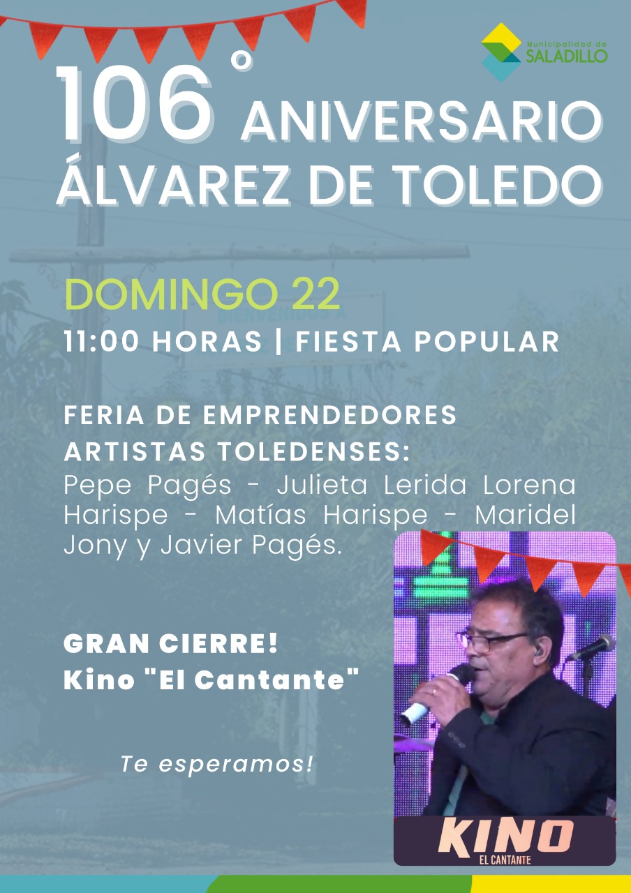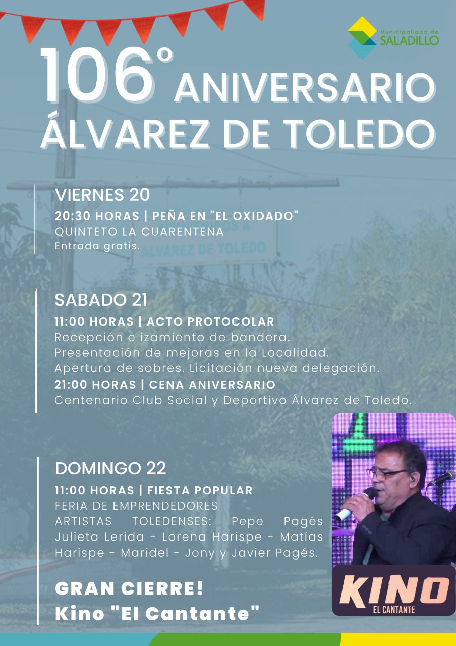 La Municipalidad de Saladillo invita a toda la comunidad a celebrar el 106°Aniversario de la Localidad de Álvarez de Toledo, con tres días de actividades, el 20, 21 y 22 de Mayo.
