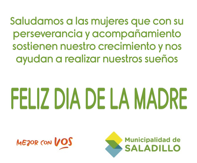SaladilloInformación General Salutación de la municipalidad de Saladillo octubre 17, 2021 - Publicidad - DIA DE LA MADRE Desde la Municipalidad de Saladillo queremos saludar a las mujeres que con su perseverancia y acompañamiento sostienen nuestro crecimiento y nos ayudan a realizar nuestros sueños. FELIZ DIA DE LA MADRE!!!