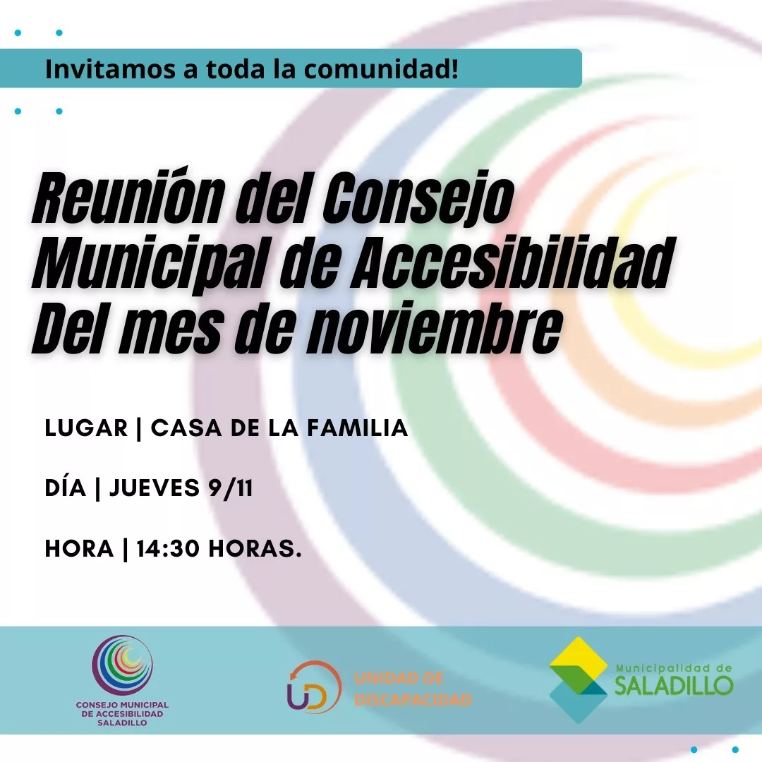 Desde la Subsecretaría de Desarrollo Humano, se invita a toda la comunidad a participar de la Reunión del Consejo Municipal de Accesibilidad correspondiente al mes de noviembre, que tendrá lugar mañana, jueves 9 en Casa de la Familia, ubicada en Posadas y Estrada, a las 14:30 hs.