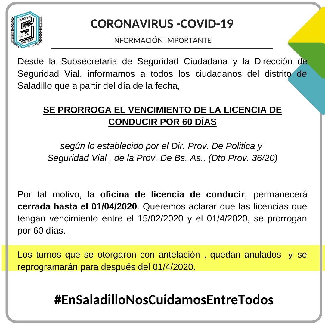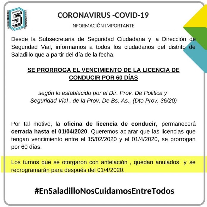 SaladilloInformación General Se prorroga el vencimiento de la licencia de conducir por 60 días marzo 18, 2020 - Publicidad -