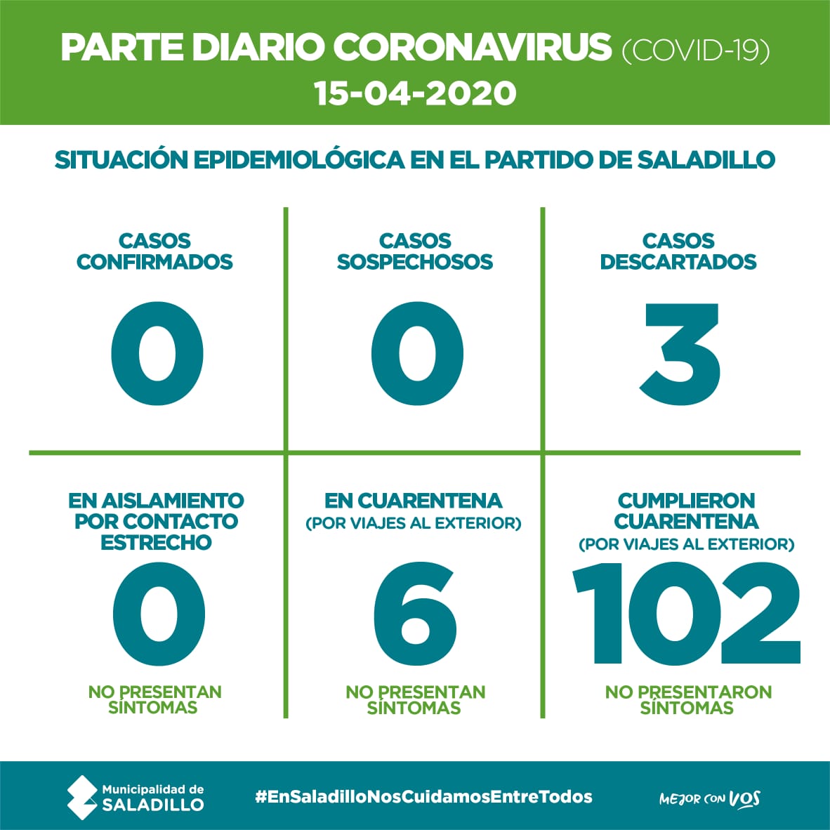 ✔ 102 personas cumplieron cuarentena obligatoria (por viaje al exterior). NO PRESENTARON SÍNTOMAS. Situación epidemiológica en el Partido de SALADILLO