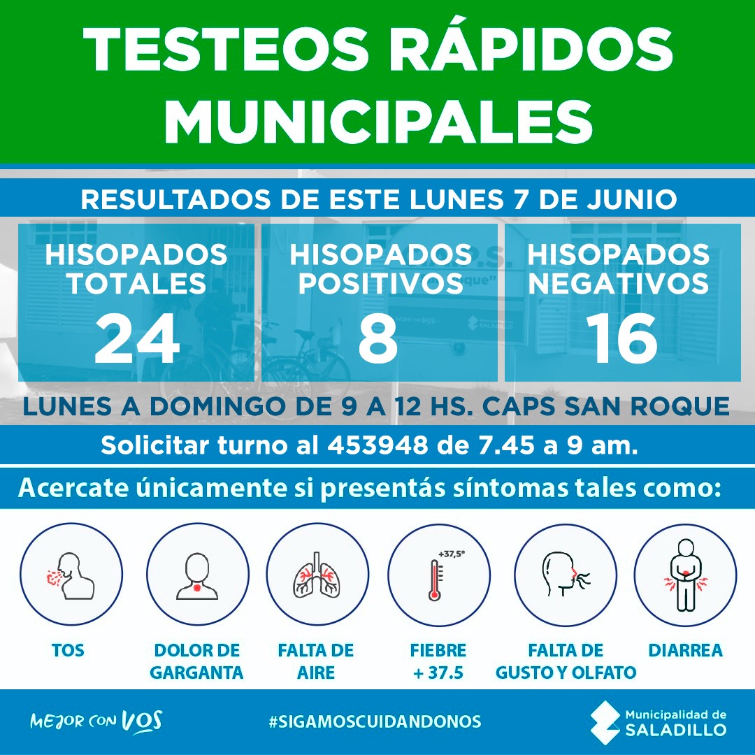 SaladilloInformación General Testeos rápidos: Hoy se registraron 8 nuevos casos positivos junio 7, 2021 - Publicidad - RESULTADOS TESTEOS RÁPIDOS MUNICIPALES Lunes 07-6-2021 Hisopados totales: 24Hisopados positivos: 8Hisopados negativos: 16