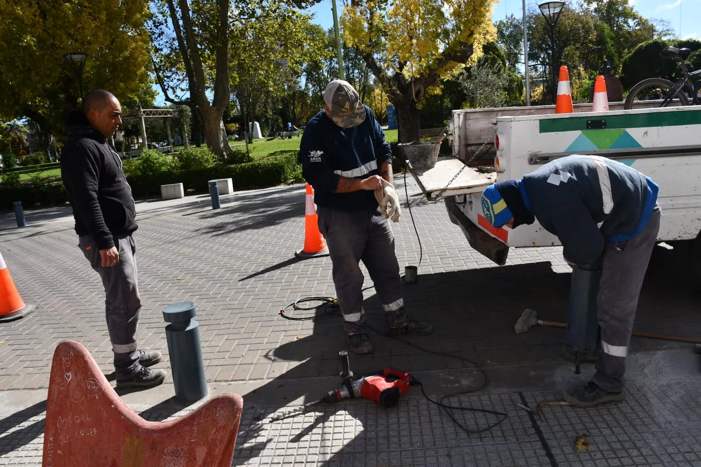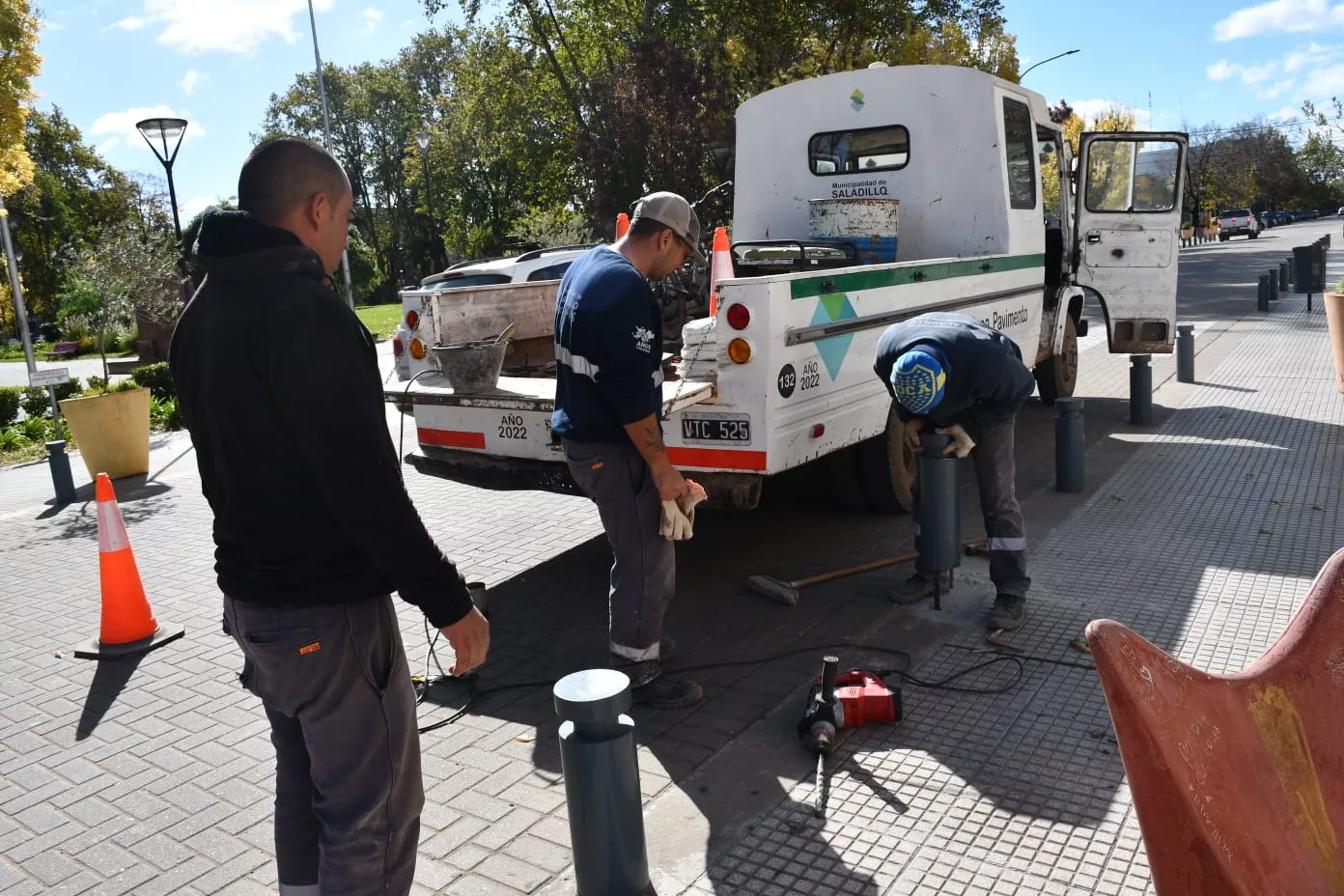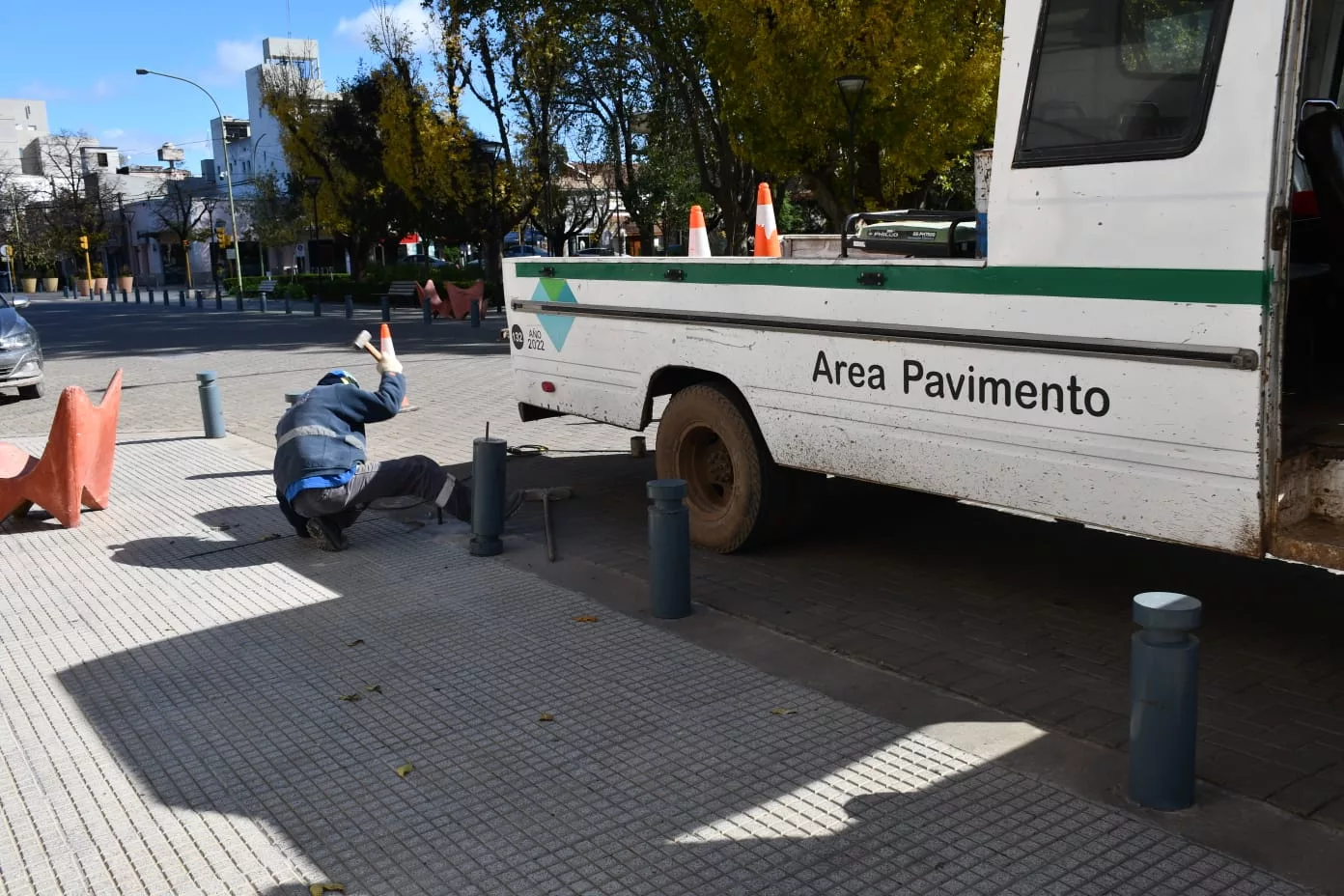 Por estos días, una cuadrilla municipal está realizando trabajos de mantenimiento general en la zona céntrica de nuestra ciudad. Allí, entre otras reparaciones, se realiza la reposición de bolardos