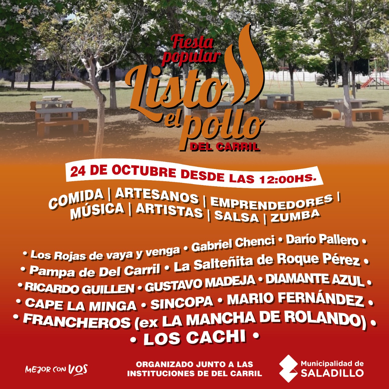 La actividad comienza al mediodía con venta de comidas a base de pollo y shows en vivo a lo largo de la jornada.También se realizará una clase de salsa y otra de zumba.